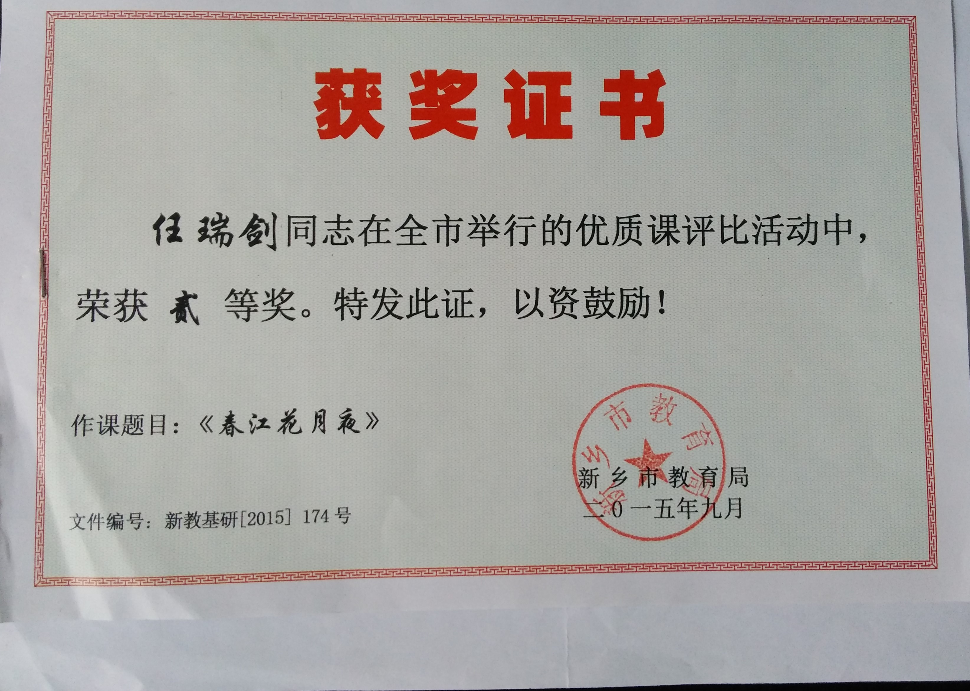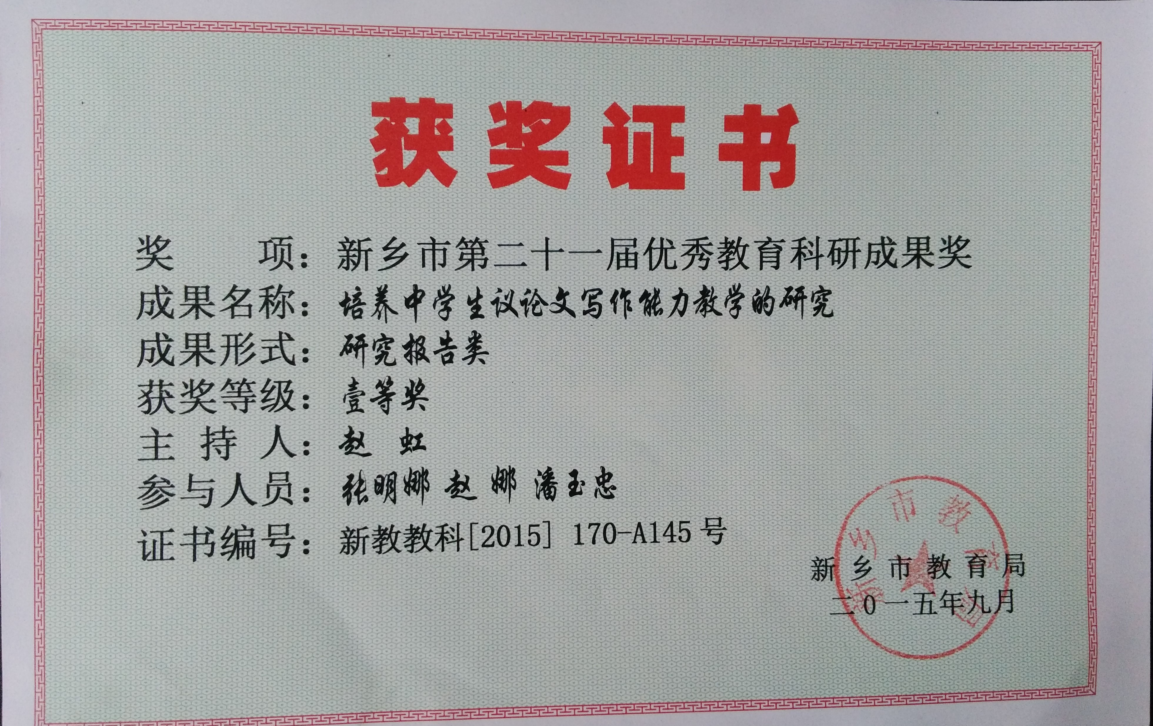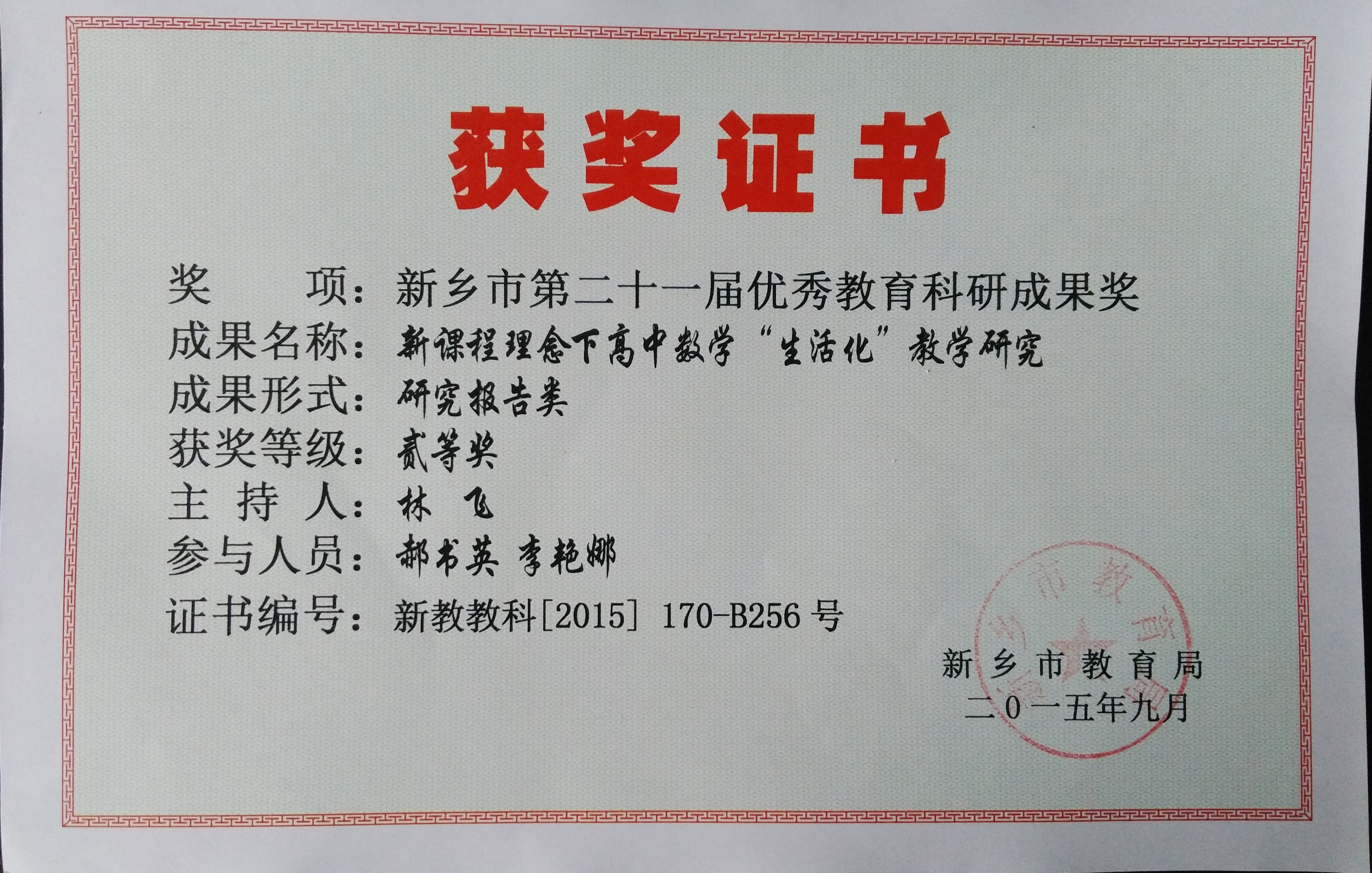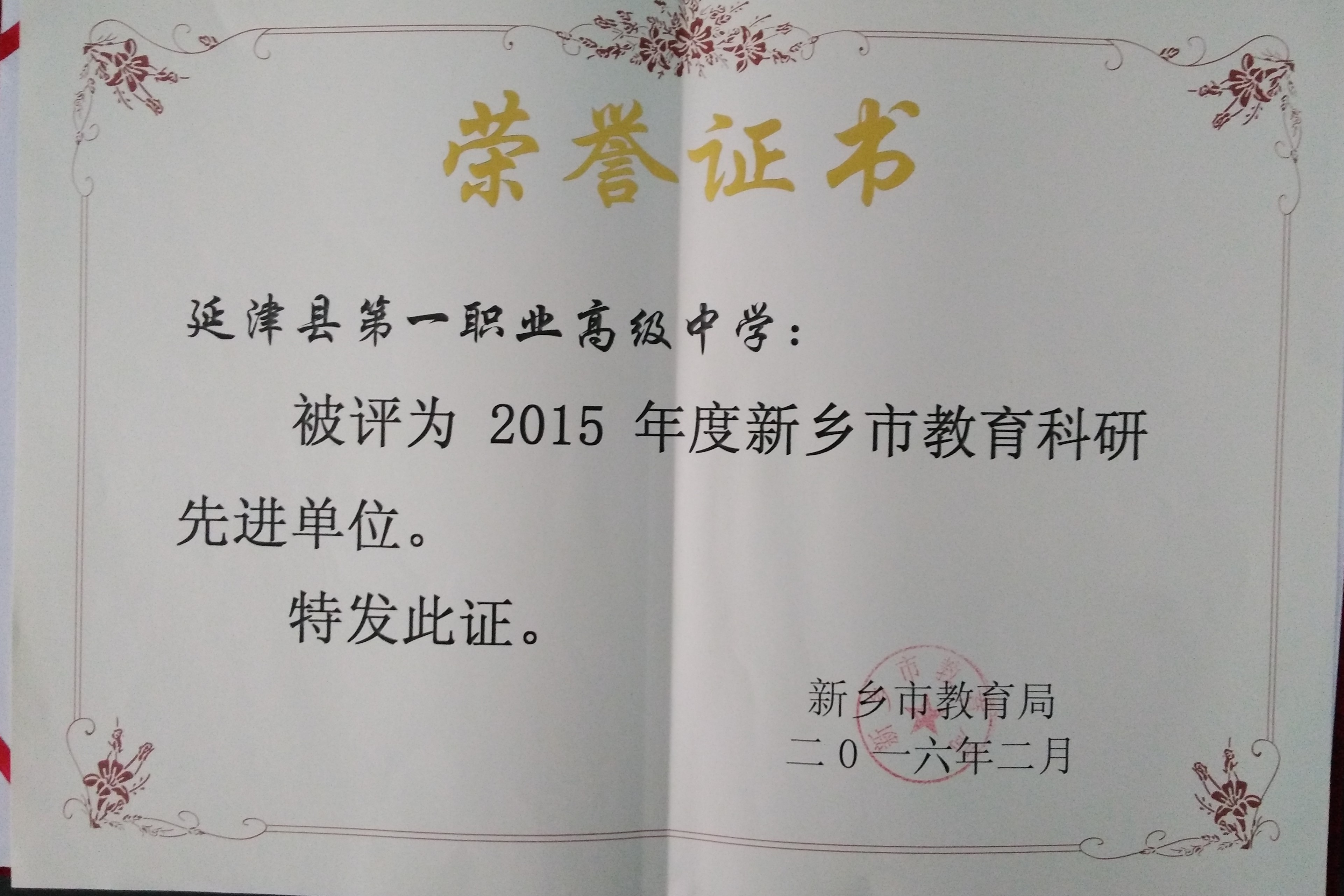 我校教师科研成果证书和我校被评为2015年度新乡市教育科研先进单位