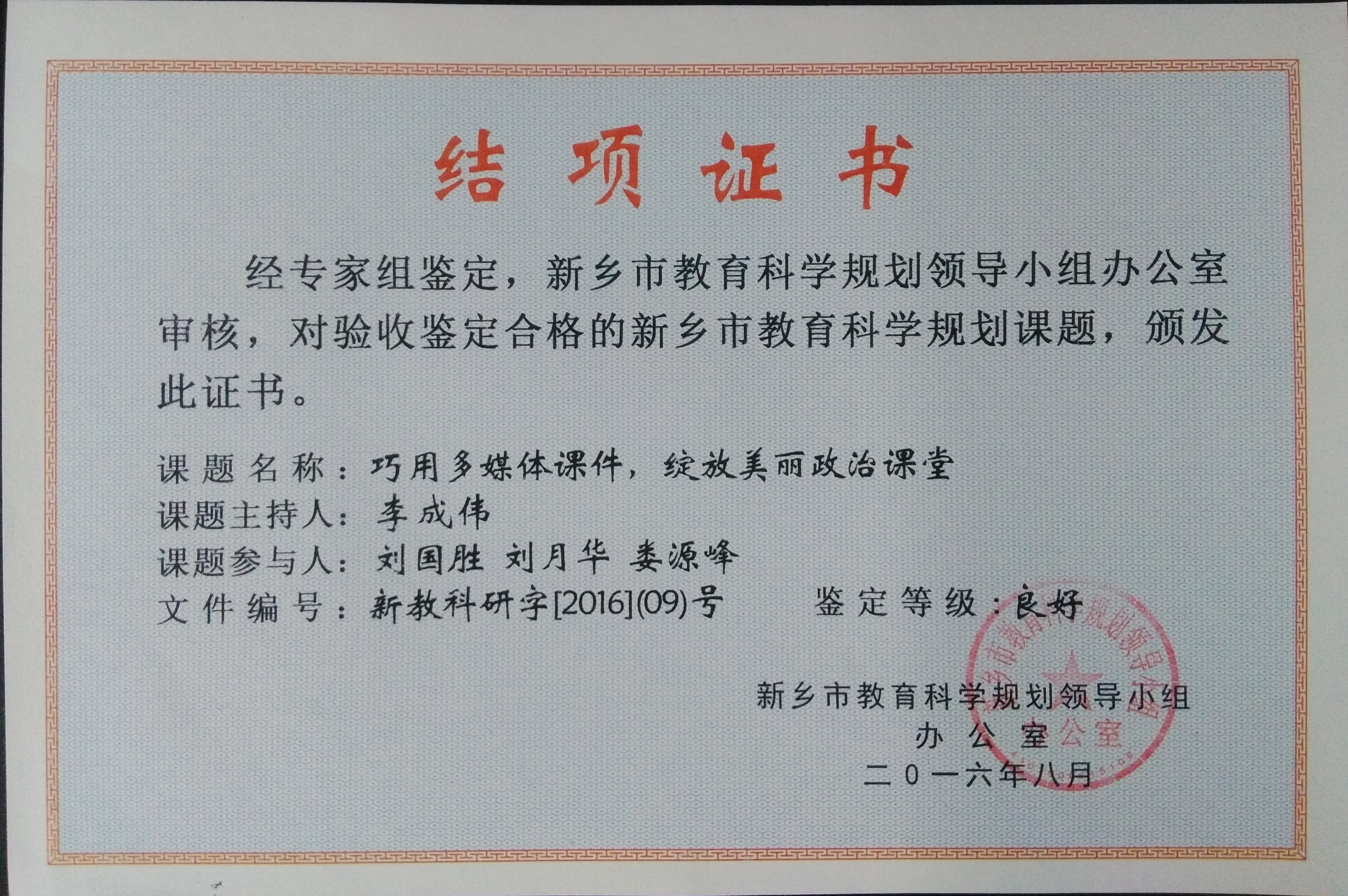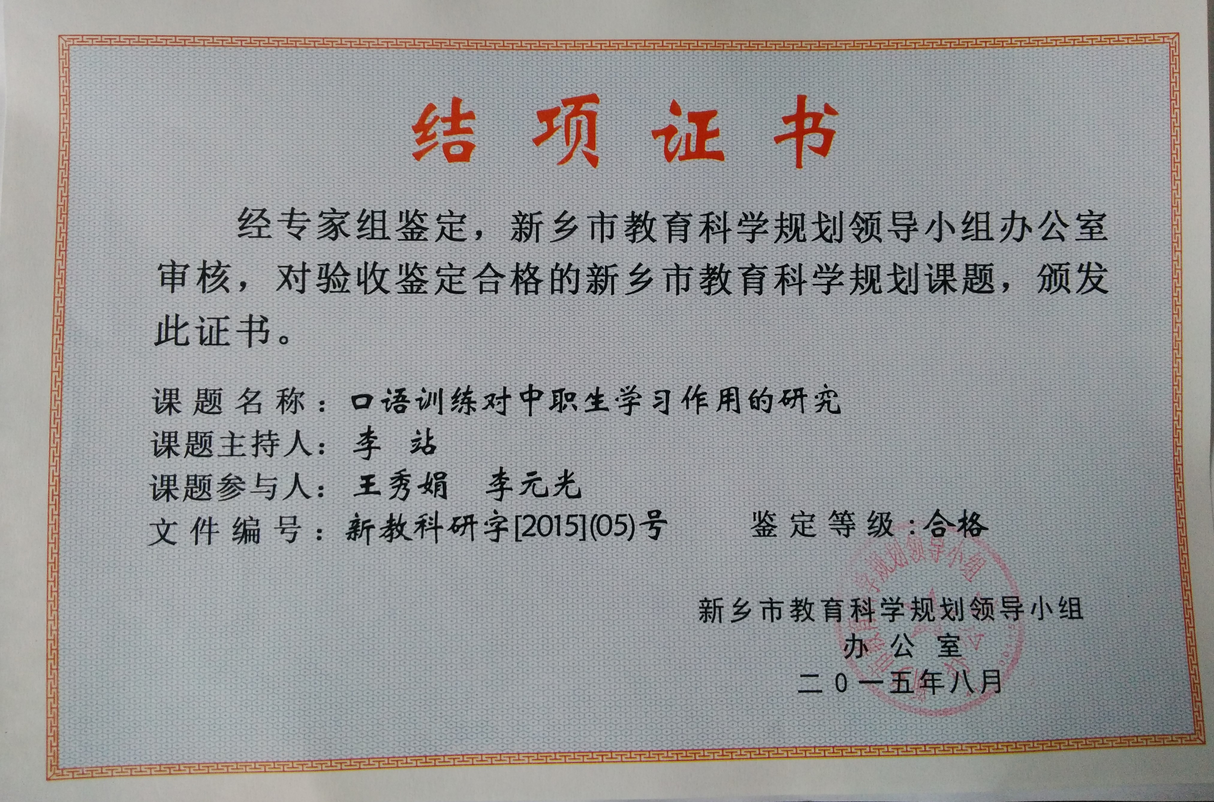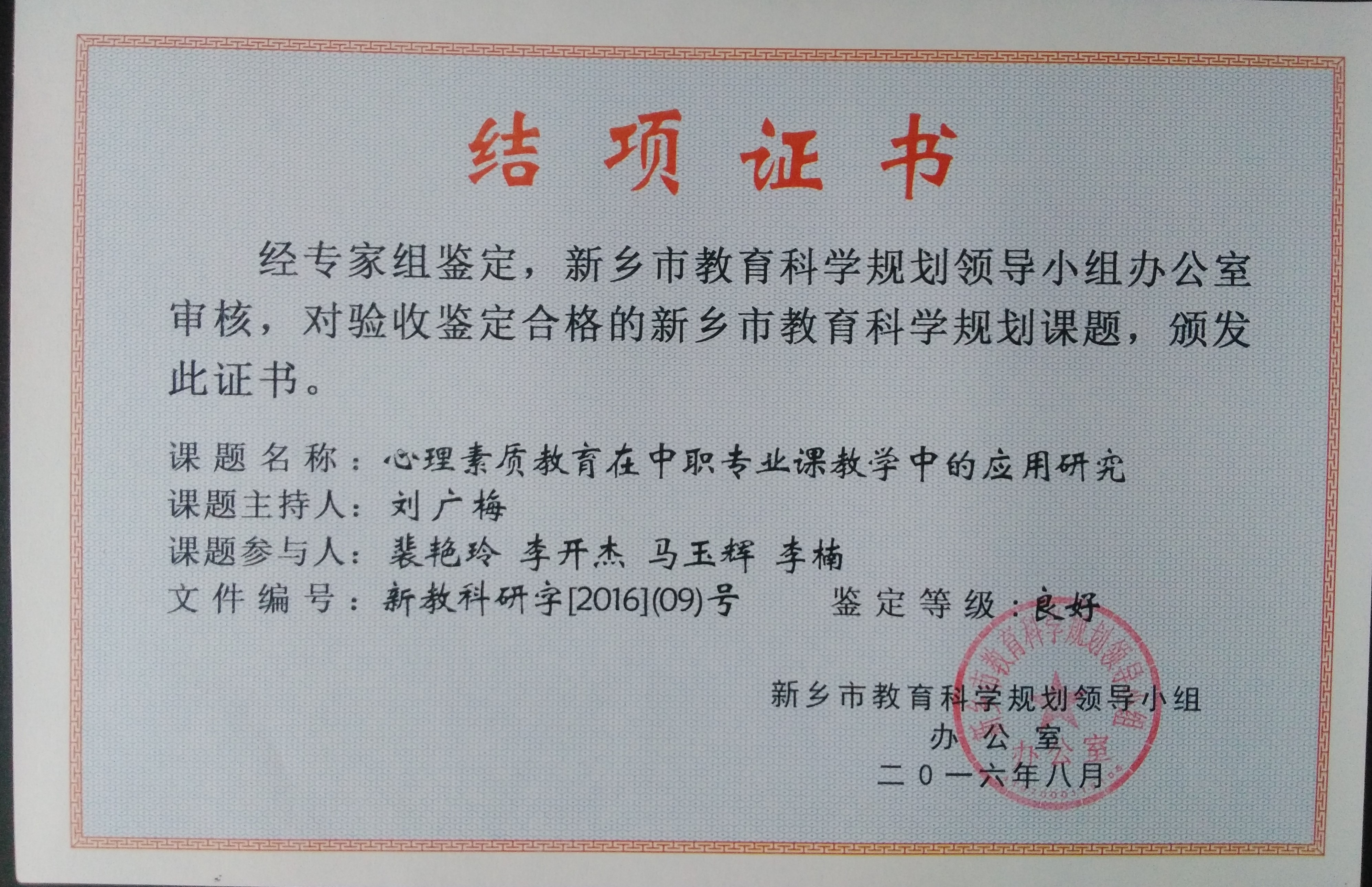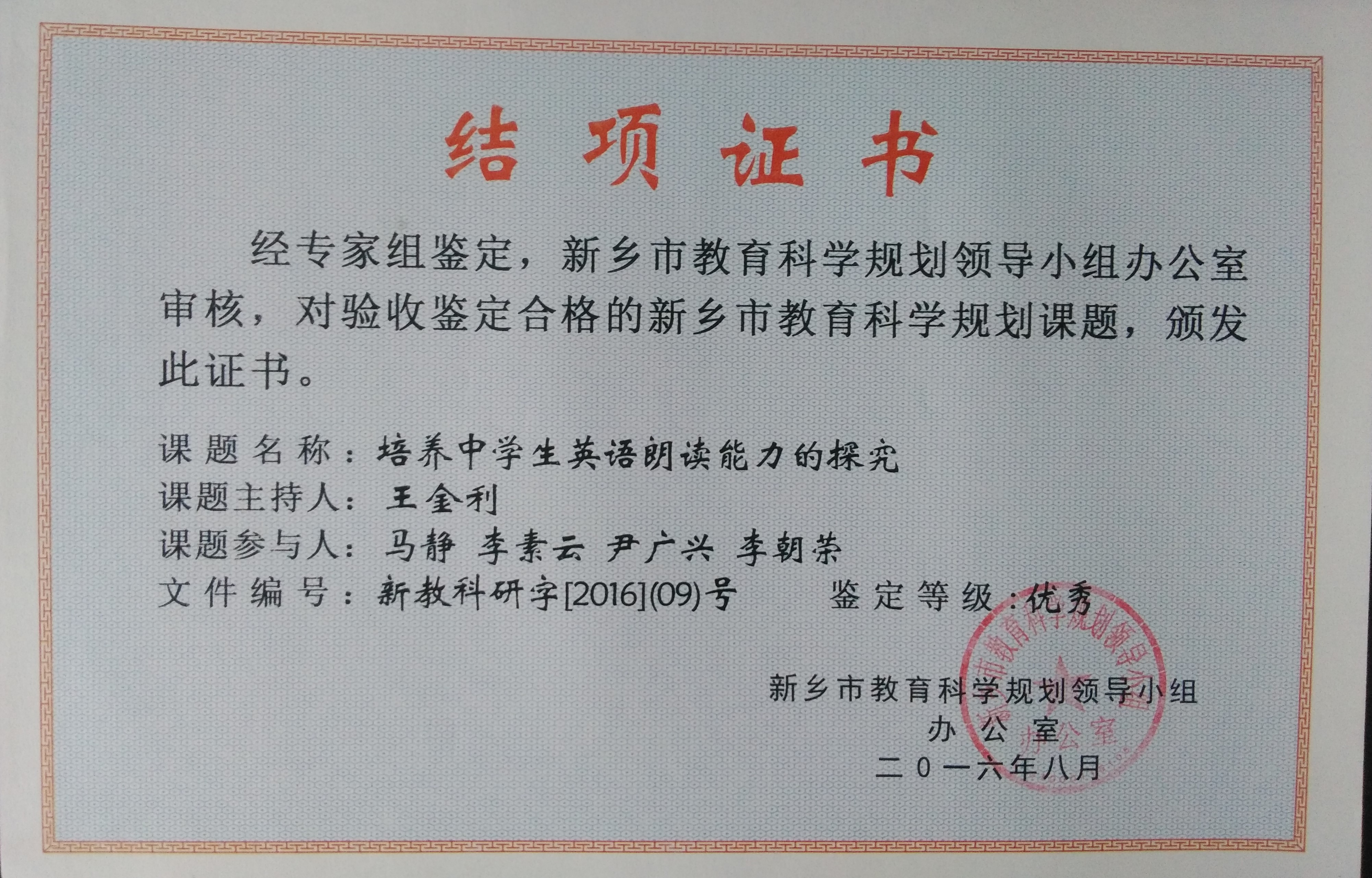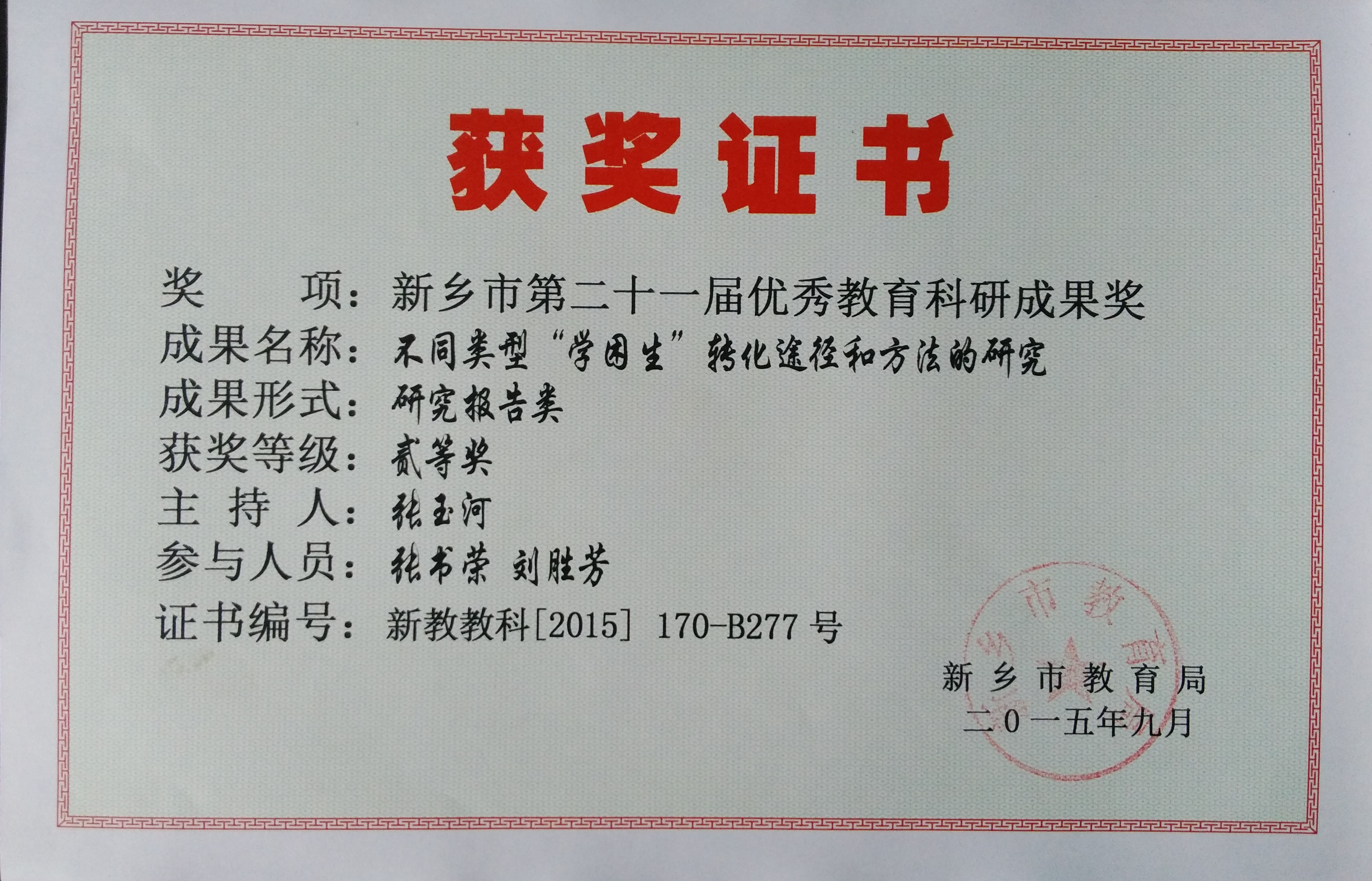 我校教师研究成果证书和我校被评为2015年度新乡市教育科研先进单位
