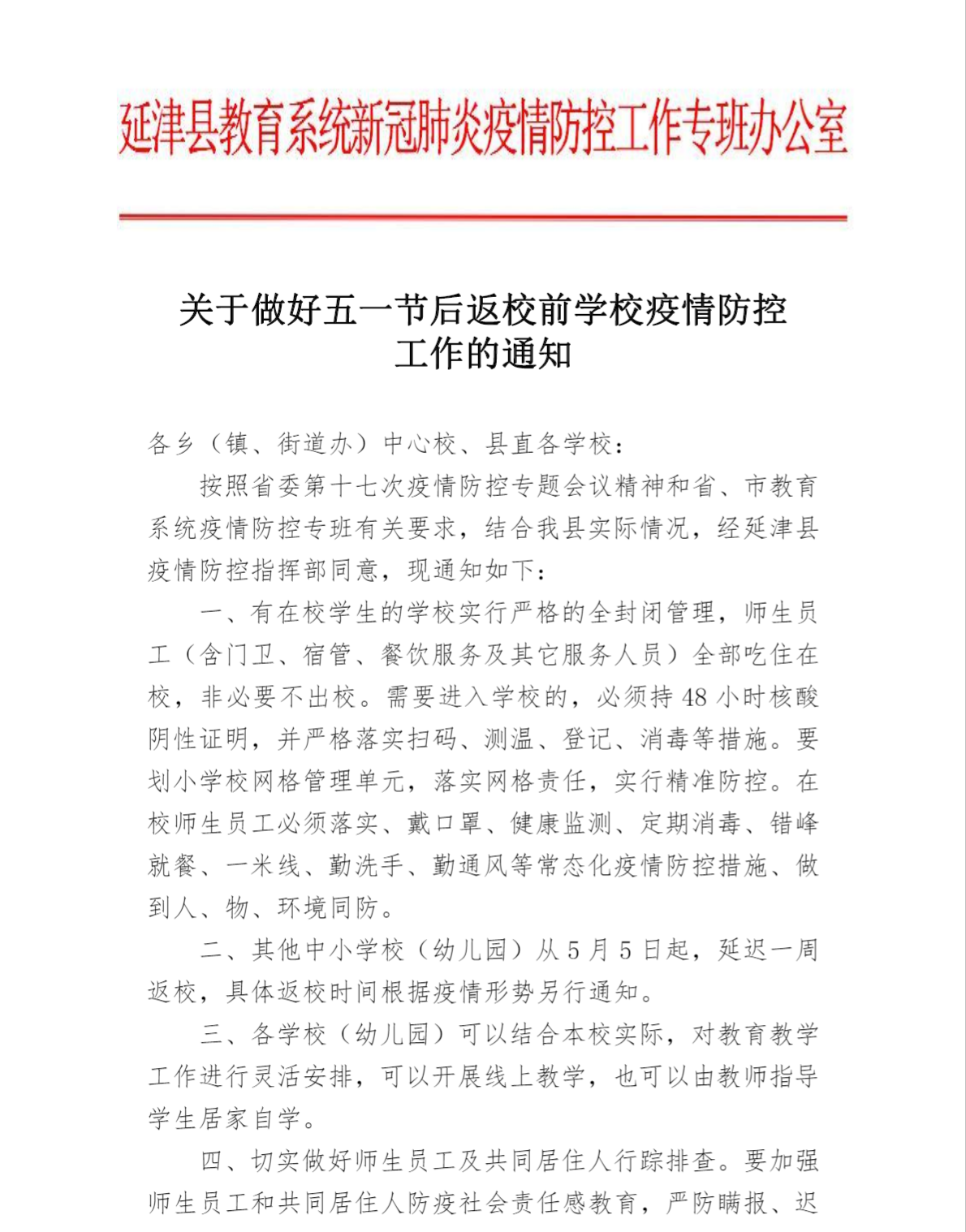 延津县教育系统新冠肺炎疫情防控工作专班办公室关于做好五一节后返校前学校疫情防控工作的通知