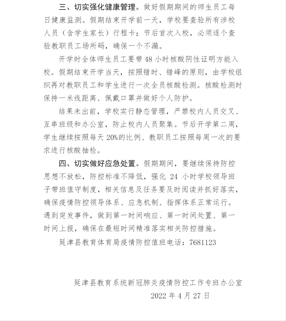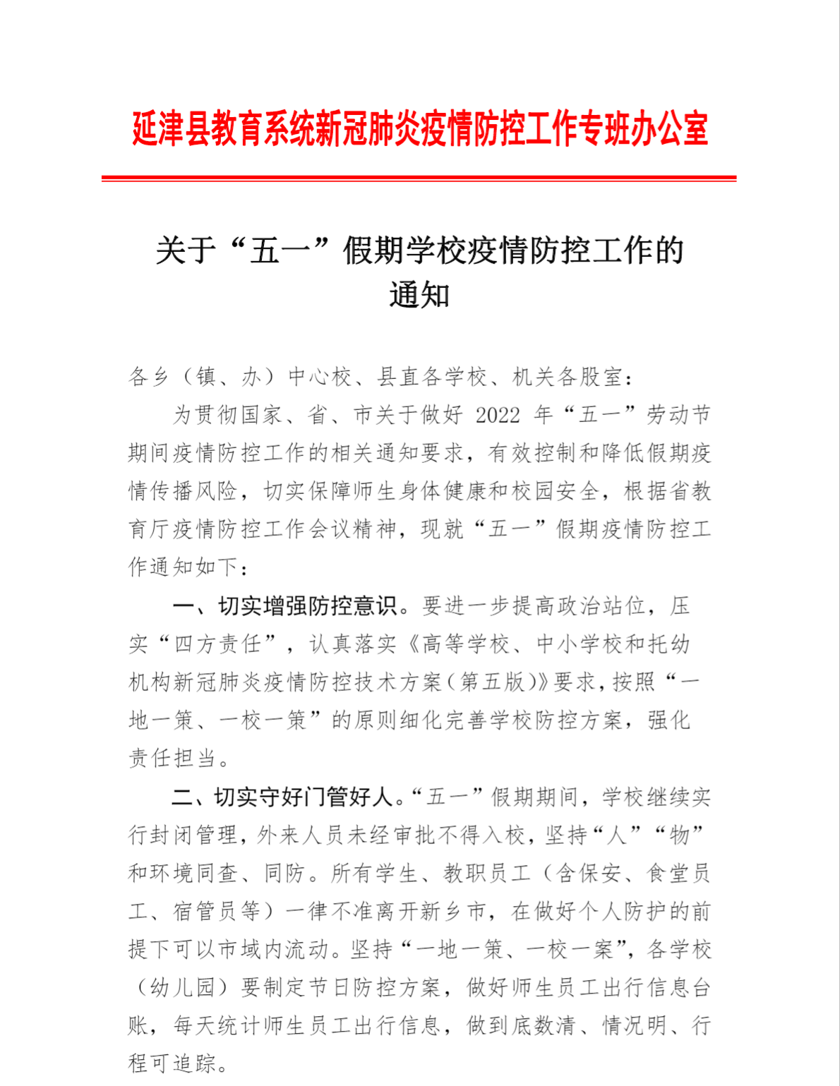 延津县教育系统新冠肺炎疫情防控工作专班办公室关于“五一”假期学校疫情防控工作的通知