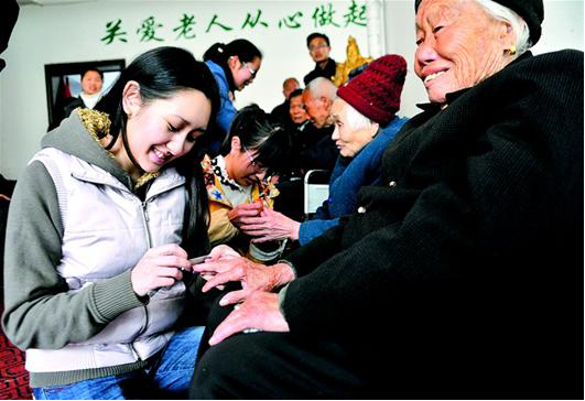 老人们一看到冒着寒冷赶来看望他们的学生,立刻关心起来,拉着我的手嘘寒问暖,十分关心我各方面的情况,体现出了老一辈对年轻一代殷切的希望和关怀,还有一些老人们也是高兴的合不拢嘴,与我分享自己当年的“金戈铁马万户候”的战争岁月,还与我聊了一些日常生活中的点点滴滴!而我也很关切地询问了老人们的身体状况和生活情况,并与他们聊起了家常,帮助他们打扫卫生,很快就融入其中,老人们都感慨的说,正是国家的各种福利和党的政策才能像今天这样无忧无虑的安享晚年的生活,更多的老人表示同学的到来为他们平淡的生活增添了生机和乐趣,我并没有因为寒冷的天气而埋怨一句,取而代之的是满腔热情,因为这次看似普通的活动中实际上蕴涵了巨大的人性价值和人文关怀,它是一种美德,更是老人与大学生之间心与心的交流与沟通,而平时娇生惯养的我,走出校园来到社会,走进老人,把老人当作朋友一样聊天,听老人们过去的事迹是如此的着迷,我还又跑到外面的小卖部给老人买东西,虽然来的时候给老人们带来了些水果、点心,可那些是远远不够的,于是,我又用我的零花钱为老人买东西来表达我的心意,从早上到中午12点,走了部分老人的房间并且慰问了老人们,到了老人吃饭的时间,我就跟着那里负责分饭的管理员一起帮助老人们进行就餐,有的老人就餐不方便,需要喂才行。这时我主动给老人喂饭,虽然笨手,但见到老人们开心的笑脸就心满意足了。我感觉到了一家人似的其乐无穷。大多数老人在这里过的很开心,他们有时在房间过楼下的广场看电视或者锻炼身体,因此,老人们在这里可以算是晚年安康了!